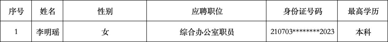 按照《锦州文旅(集团)有限公司2025年招聘公告》招聘工作的有关安排,经过笔试、面试、体检和考察等程序,确定以下1人为锦州文旅(集团)有限公司拟录用员工,现予以公示。公示期间如有意见,请向锦州文旅(集团)有限公司纪检监察部致电反映。